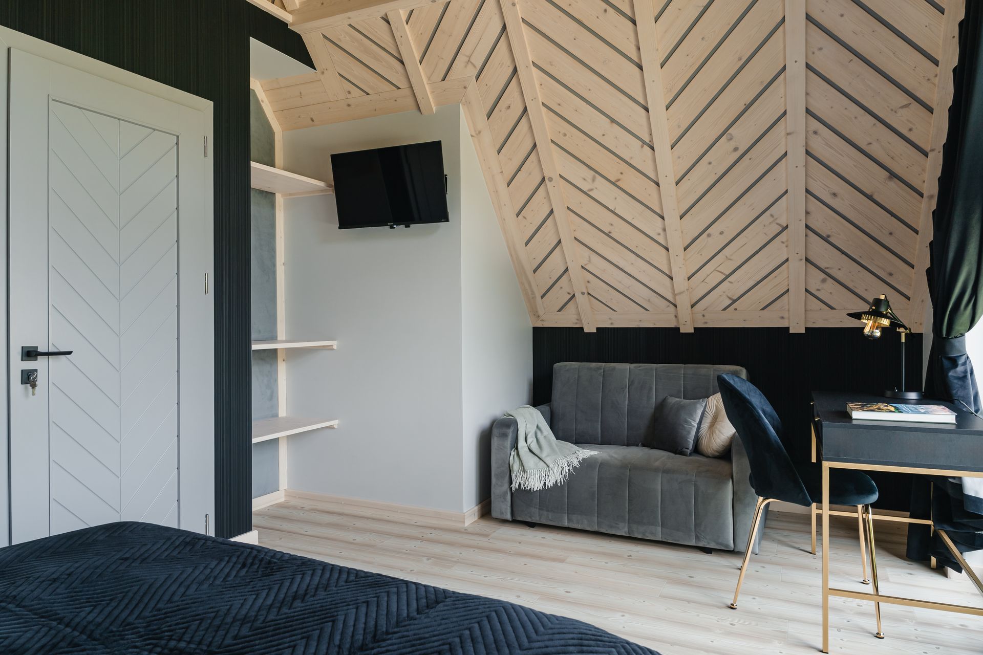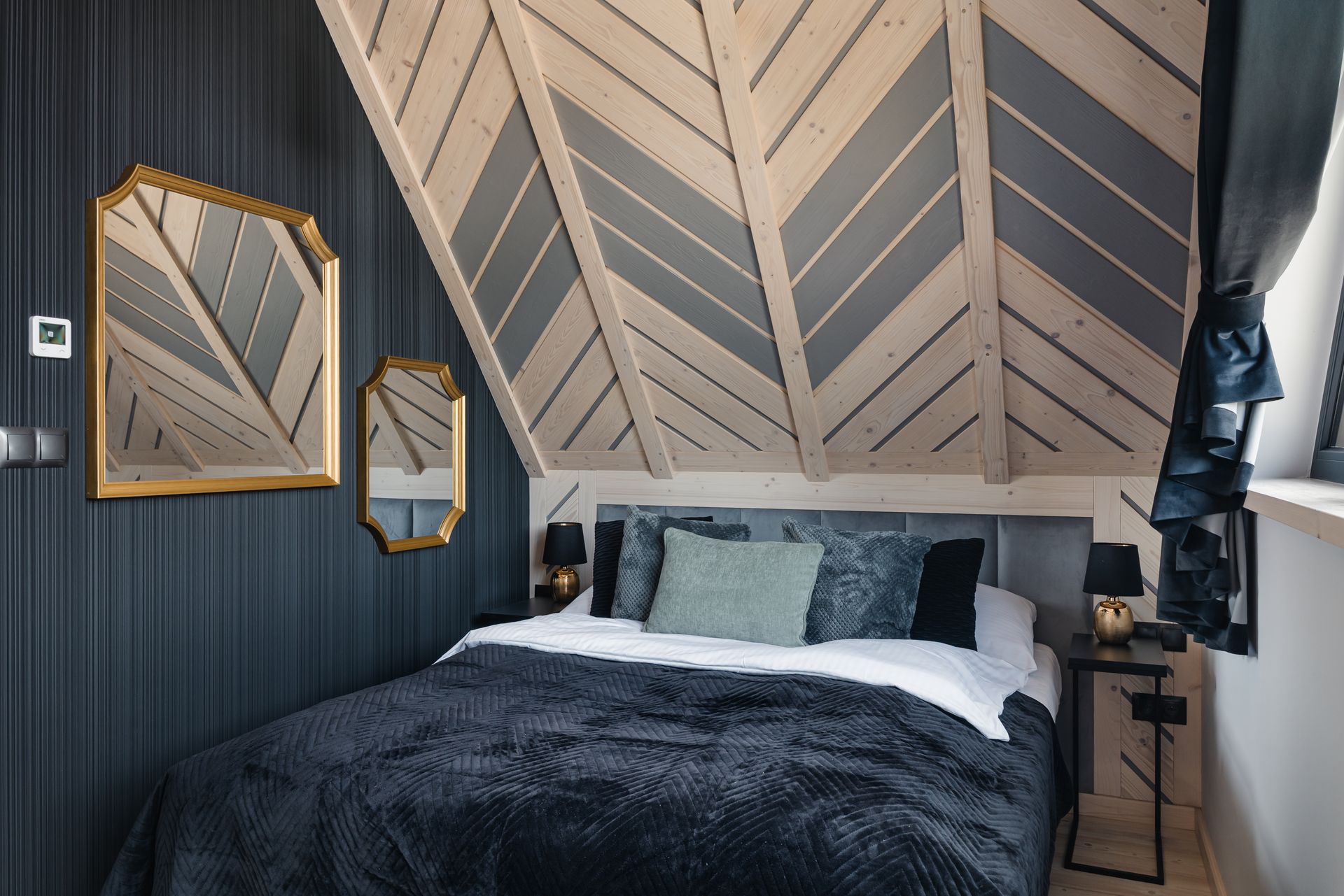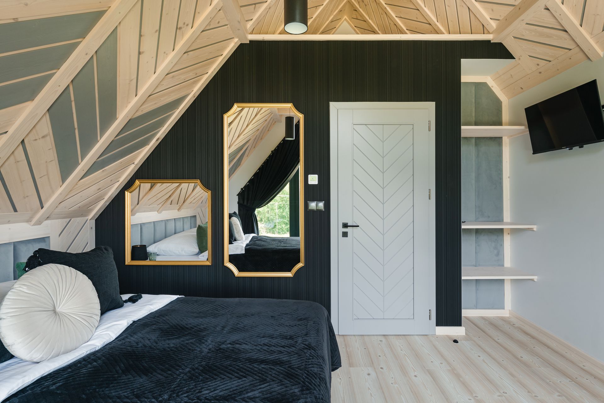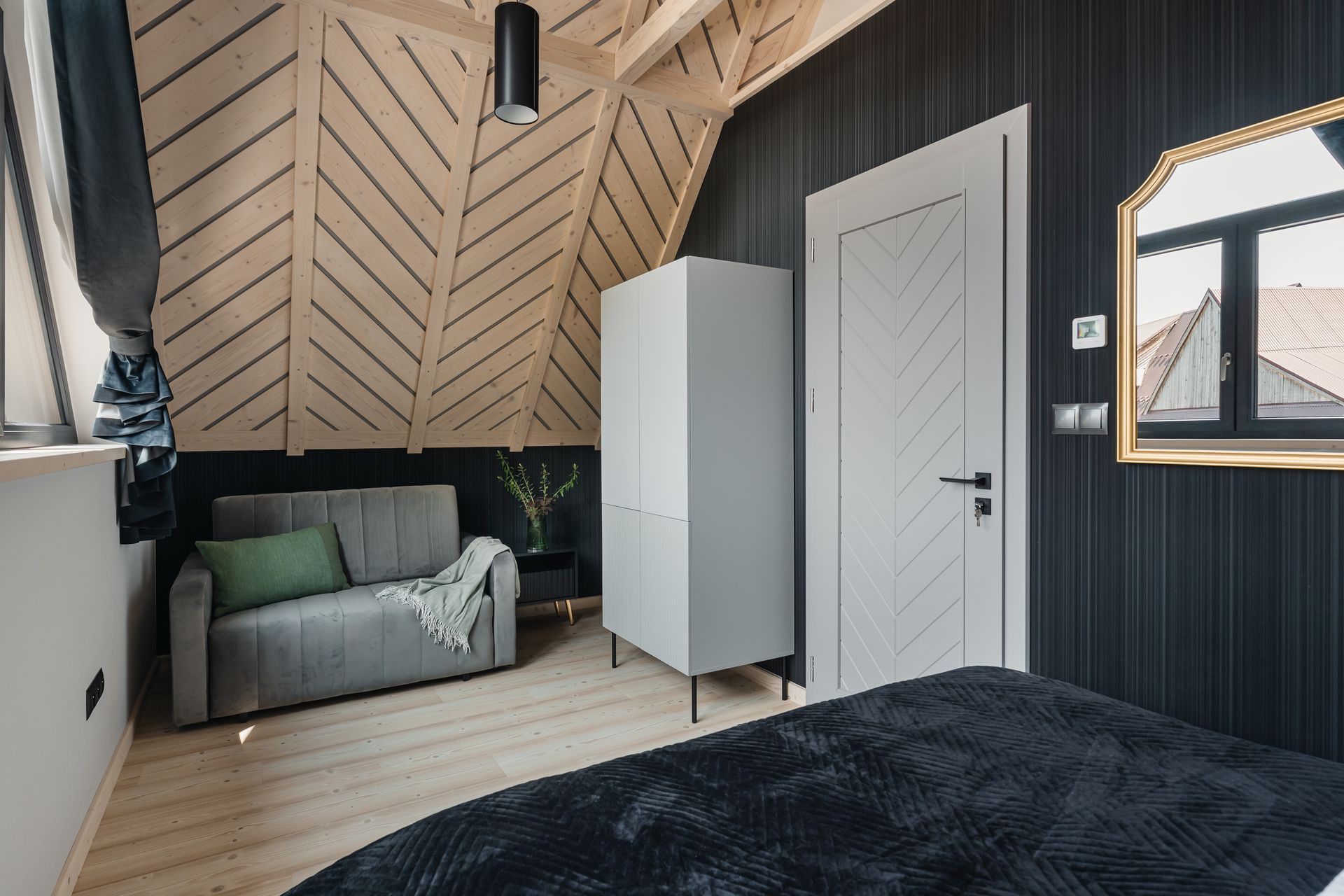 - na piętrze domku przygotowaliśmy dwie sypialnie. W każdej z sypialni duże łóżko podwójne oraz rozkładana sofa dwuosobowa.