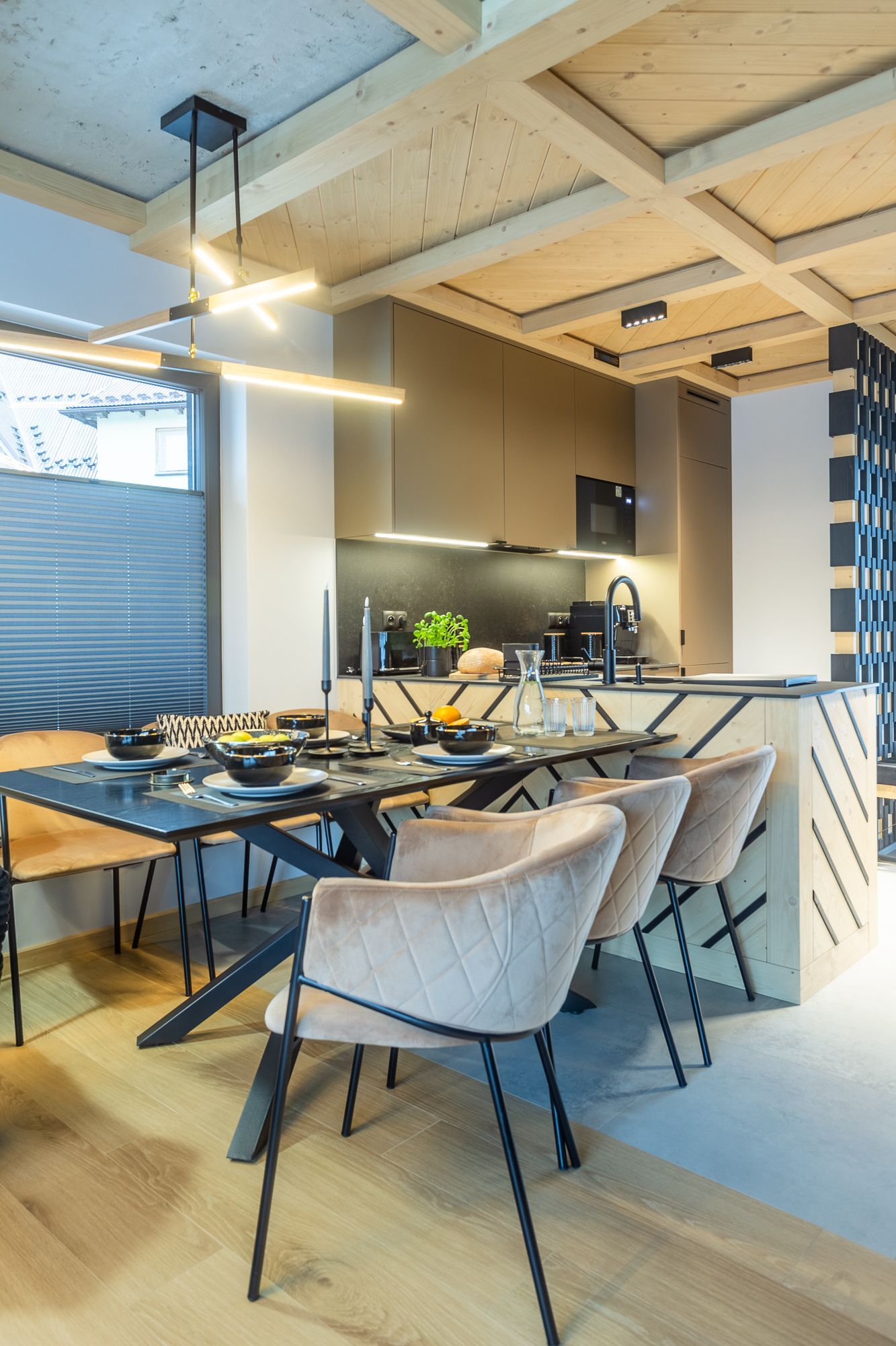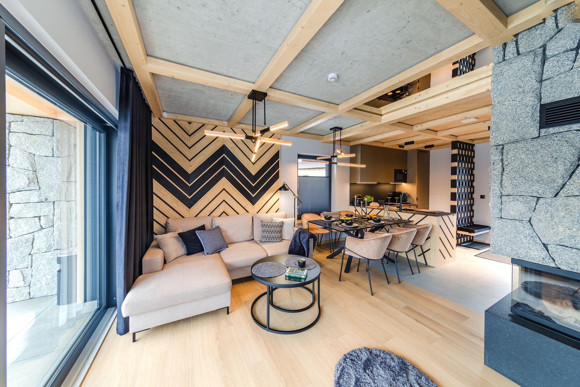 - na parterze znajduje się jadalnia, kuchnia, łazienka oraz salon z kominkiem. Przestronne przeszklone drzwi balkonowe typu HST prowadzą na duży taras, który jest jakby przedłużeniem salonu.