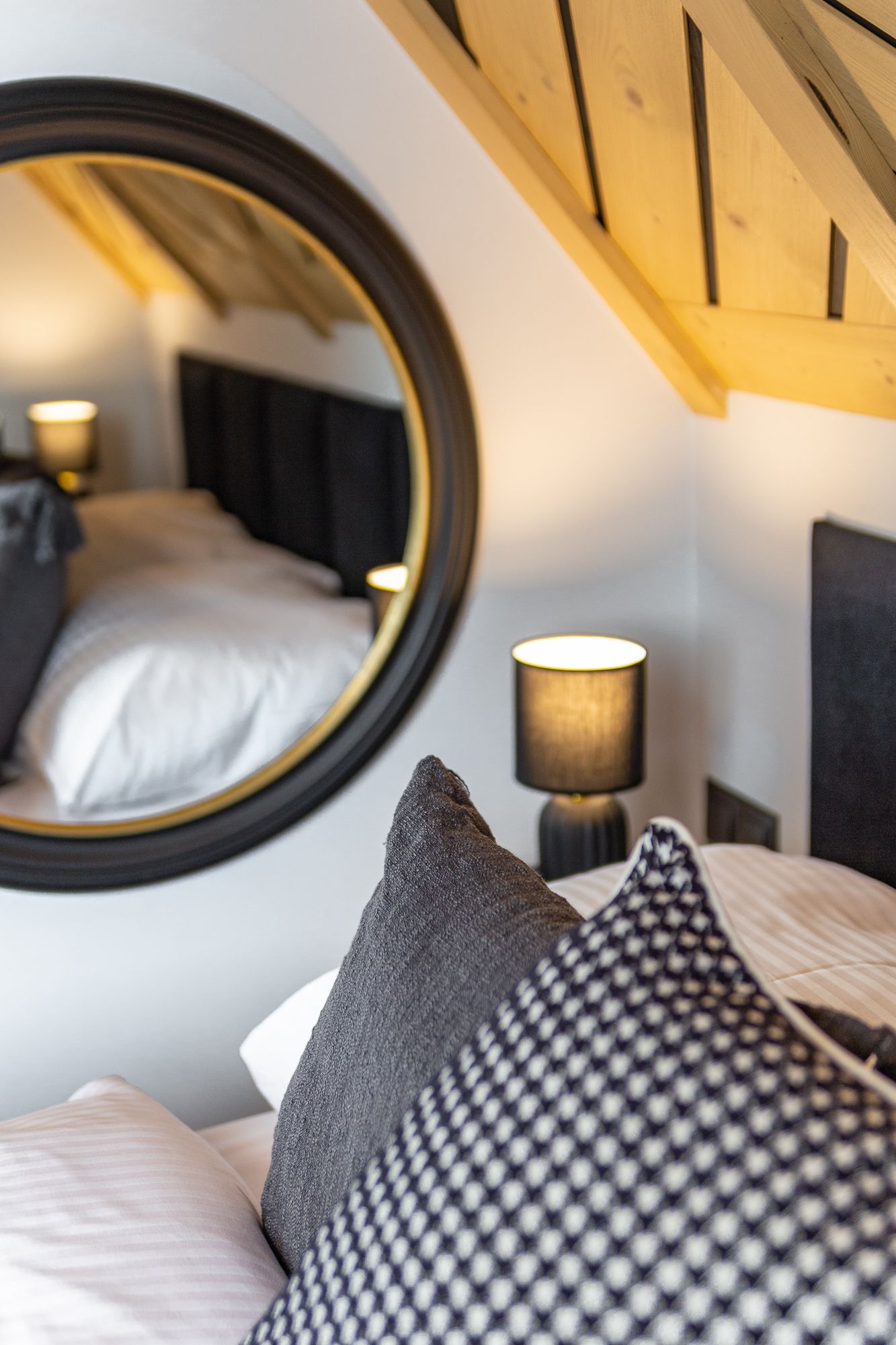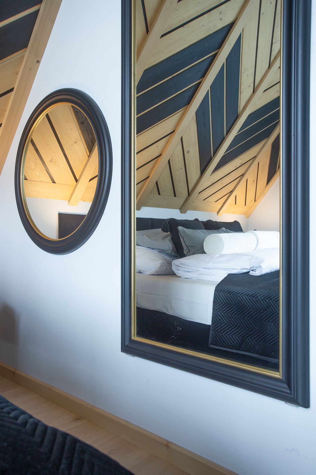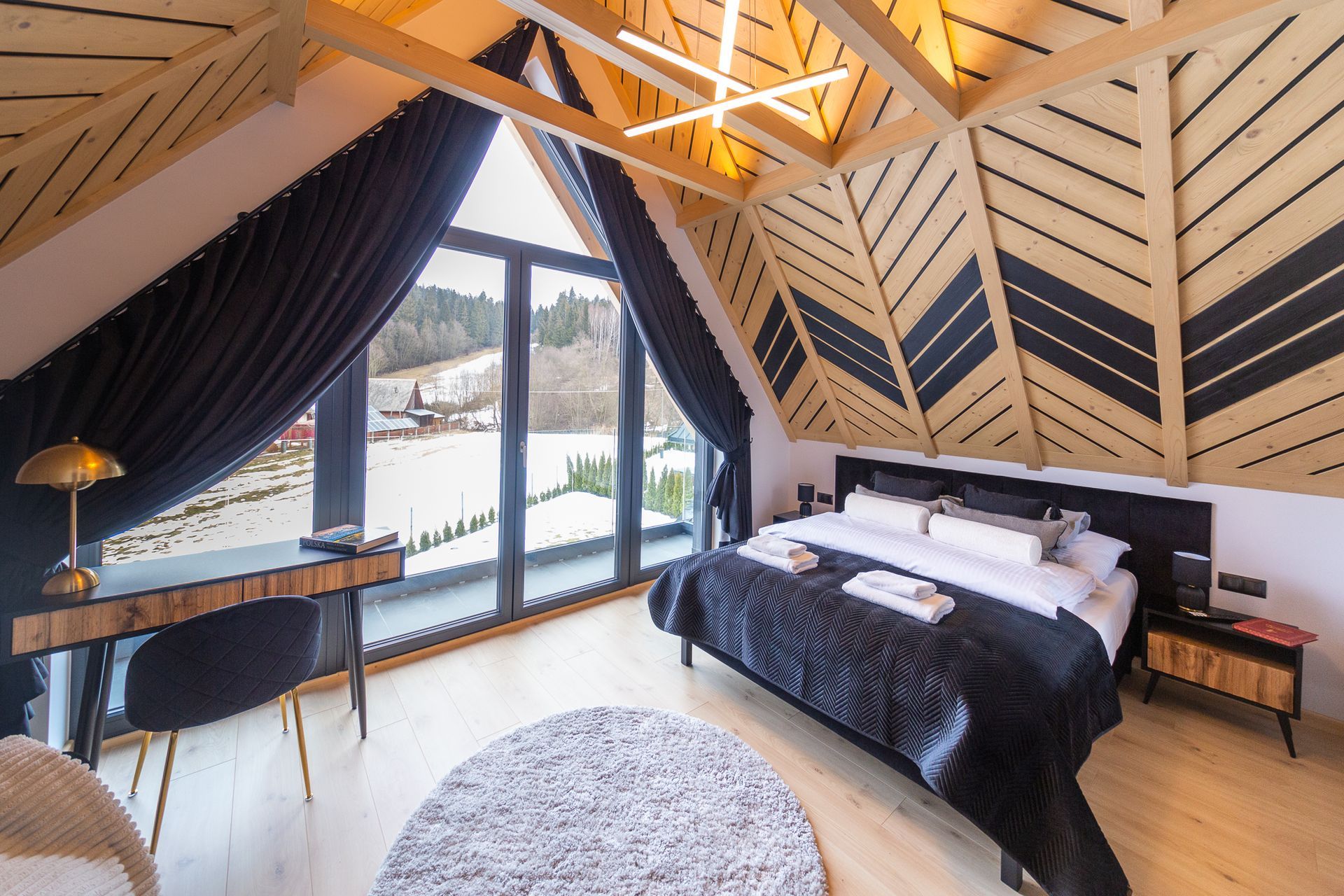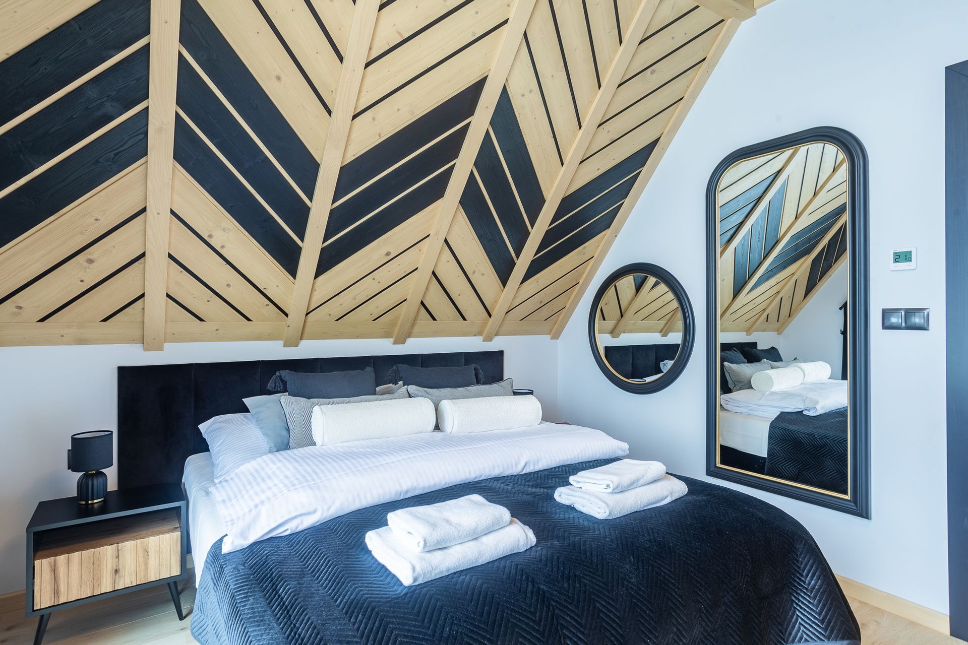 - na piętrze domku przygotowaliśmy dwie sypialnie. W każdej z sypialni duże łóżko podwójne oraz rozkładana sofa dwuosobowa.